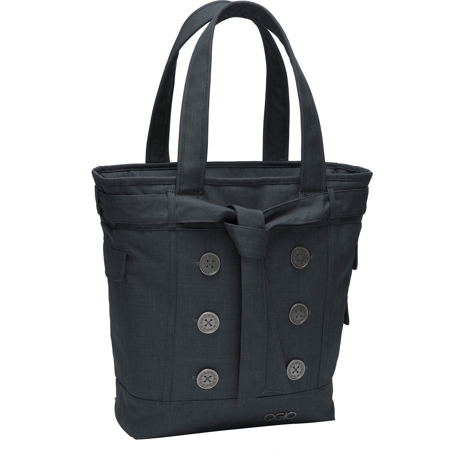 Large metal buttons give this feminine tote a classy look, while padded tech compartments make it perfect for work or school. | T/C 900D two-tone cotton/poly Top-entry padded laptop compartment Padded tablet/e-reader sleeve Three side flap pockets Fully padded base to protect laptop Large zippered interior compartment Two interior elastic side pockets for cords and beverage storage Interior zippered valuables pocket Removable decorative belt Easy-access deluxe organization panel with zippered pocket Padded grab handles Laptop sleeve: 14.5'h x 10.5'w x 1'd; fits most 15' laptops Dimensions: 15'h x 16.5'w x 4'd Capacity: 1,000 cu.in./16L Weight: 1.6 lbs./0.62kg Bags not intended for use by children 12 and under.