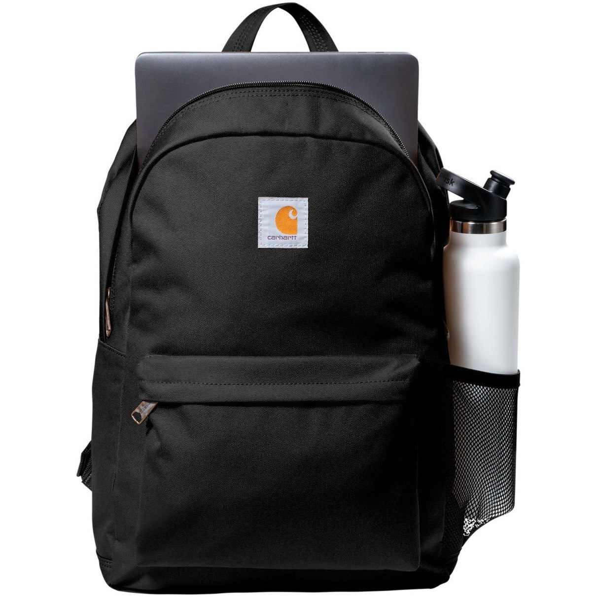 This no-nonsense pack is built for everyday hauling. Made of canvas with a water-shedding coating, it can easily handle any work or school commute. 500D polyester Rain Defender durable water repellent (DWR) Large main compartment with elastic pocket Front zippered pocket with 2 mesh pockets and key fob Mesh side pocket Padded shoulder straps for comfort Carhartt label sewn on front Capacity: 21L Dimensions: 17.5'h x 12'w x 6'l Note: Bags not intended for use by children 12 and under.