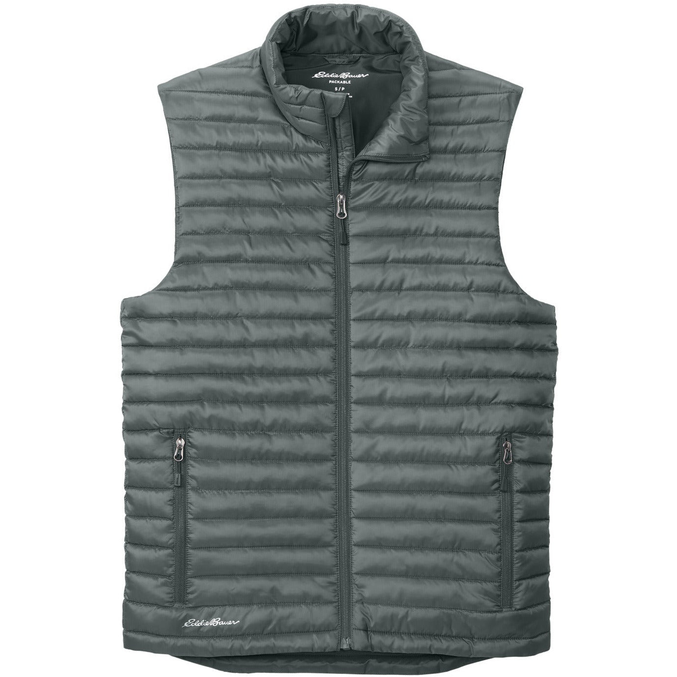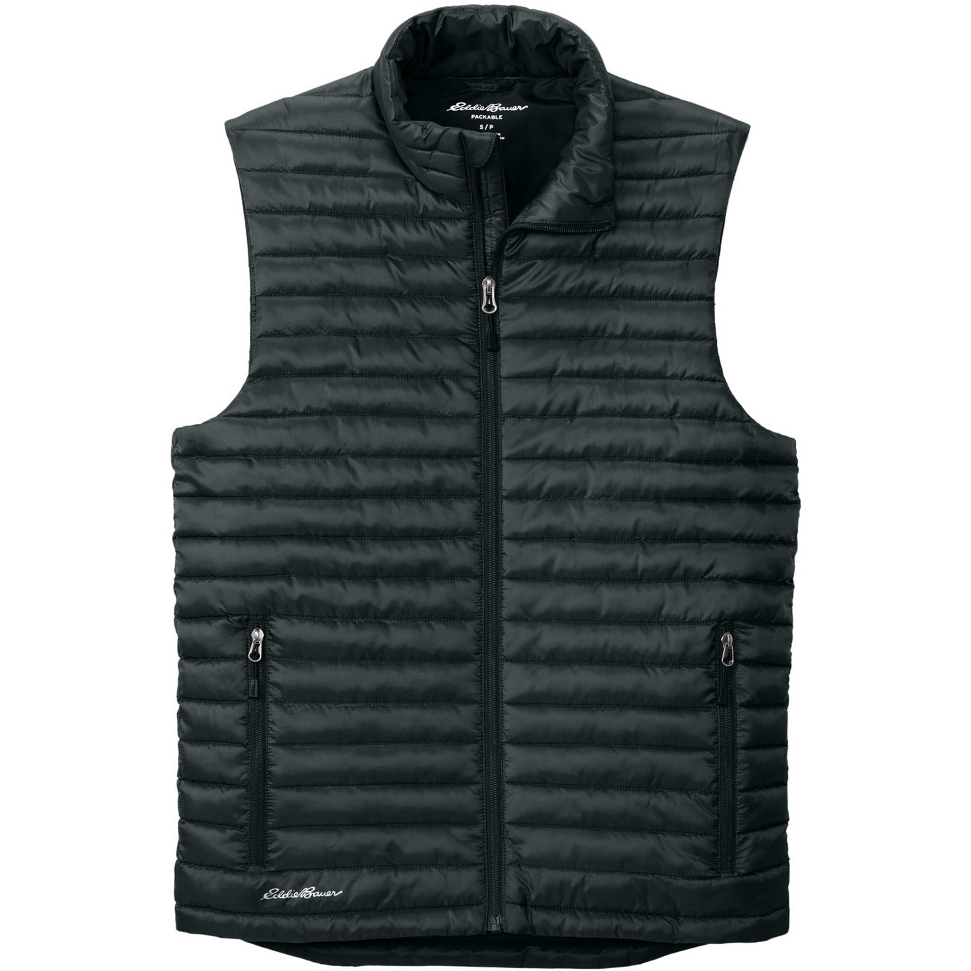 Designed with traditional quilt lines, this insulated vest is built for warmth and weather-resistant performance. Features include full-length interior storm flap with chin guard, exposed, molded zippers with Eddie Bauer logo pulls, zippered hand pockets and a slight drop tail hem. Includes an embroidery access pocket. Packs into zippered left hand pocket. Contrast Eddie Bauer heat transfer logo on right hem. Made of 100% polyester ripstop and 3.8-ounce, 100% polyester blown fill. PU coating on back of shell. Durable water-repellent (DWR) finish.