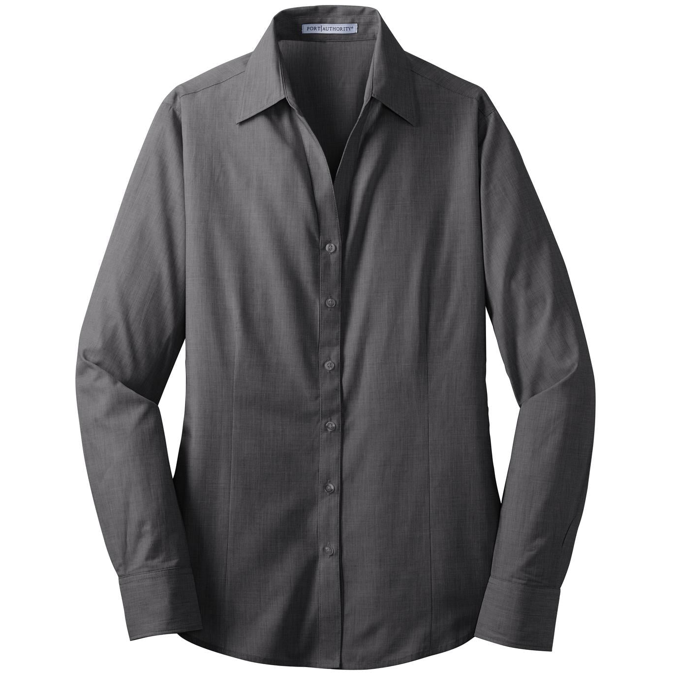 With a beautiful two-color weave--not to mention wrinkle resistance--this poplin shirt has a pleasing texture and truly impresses in the office. | 3-ounce, 60/40 cotton/poly Open collar and neckline Front and back darts Pearlized buttons Mitered two-button cuffs
