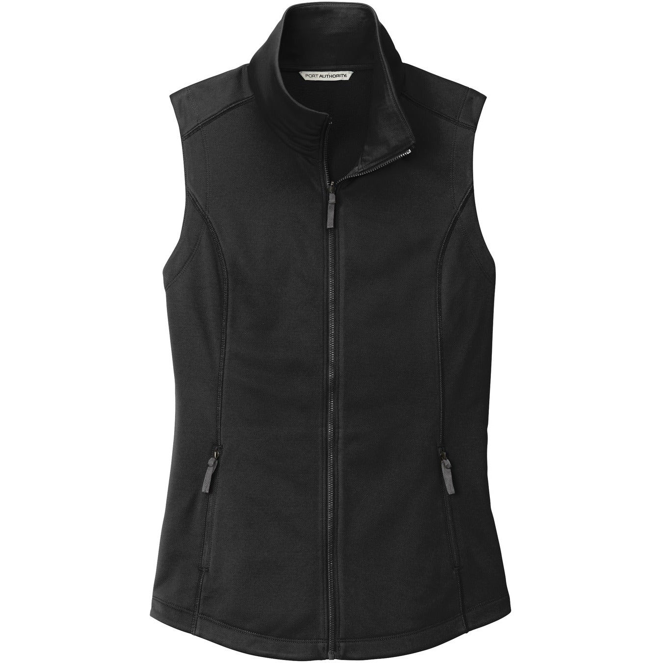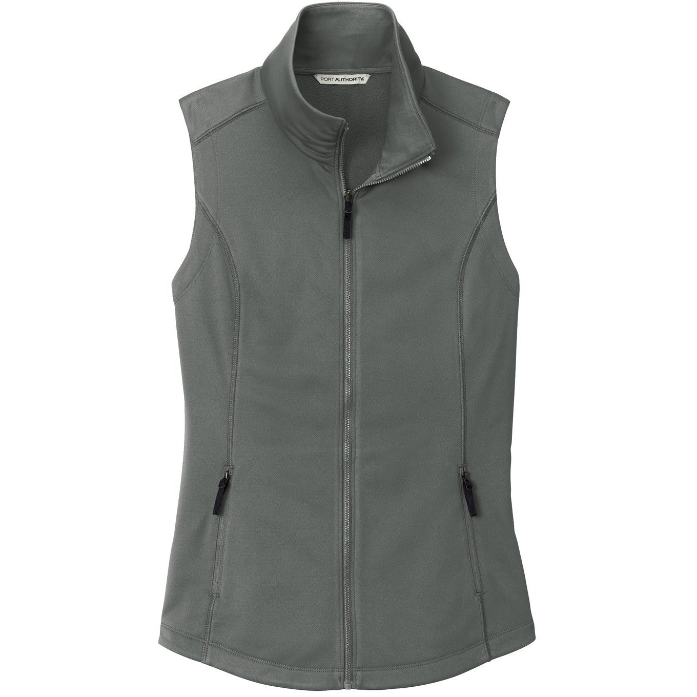 A smooth face, brushed back and coverstitching make this warm fleece vest a classier alternative to more casual fleece. Can be zipped in and secured by snap attachment inside an outer Collective layer 5.9-ounce, 100% polyester fleece Dyed-to-match and contrast coverstitch Slightly longer length Ruching at collar Molded center front zipper Front reverse-coil zippered pockets Tulip hem