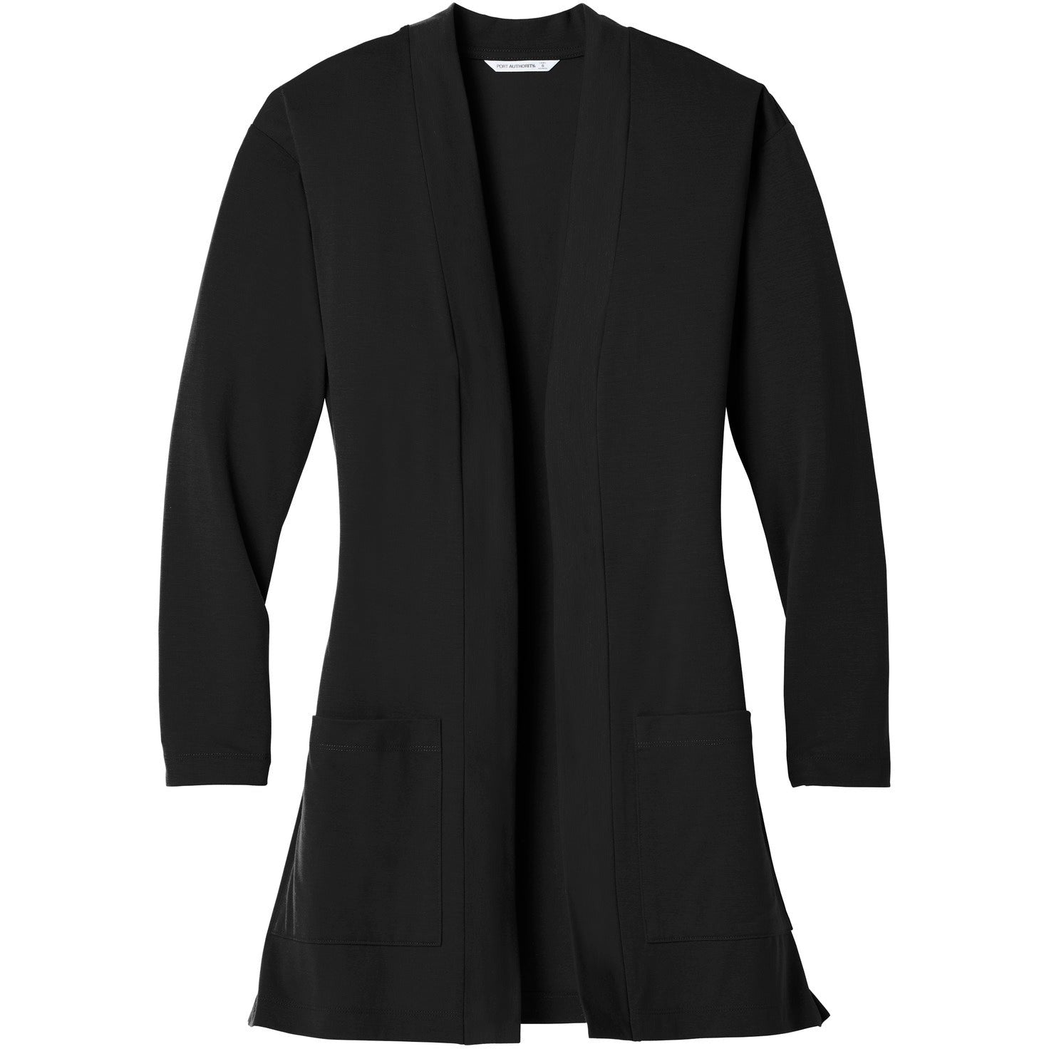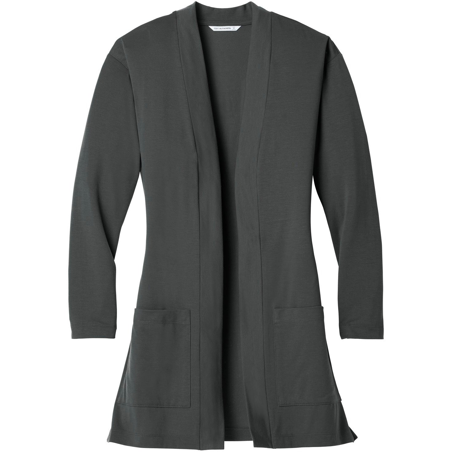 A versatile cardigan with ease of movement and a longer length, ideal for a busy life. 4.4-ounce, 62/33/5 poly/rayon/spandex jersey knit Open front Two patch pockets Hem vents