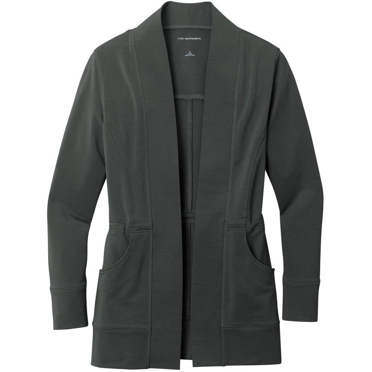 A layering must-have made of ultra-soft, snag-resistant microterry-it's as comfortable as it is polished in appearance. 6.8-ounce, 62/33/5 poly/rayon/spandex microterry Snag-resistant Tag-free Open front cardigan Interior drawcord with toggles at waist Front pockets Curved back yoke Front and back seaming details Self-pieced cuffs and hem