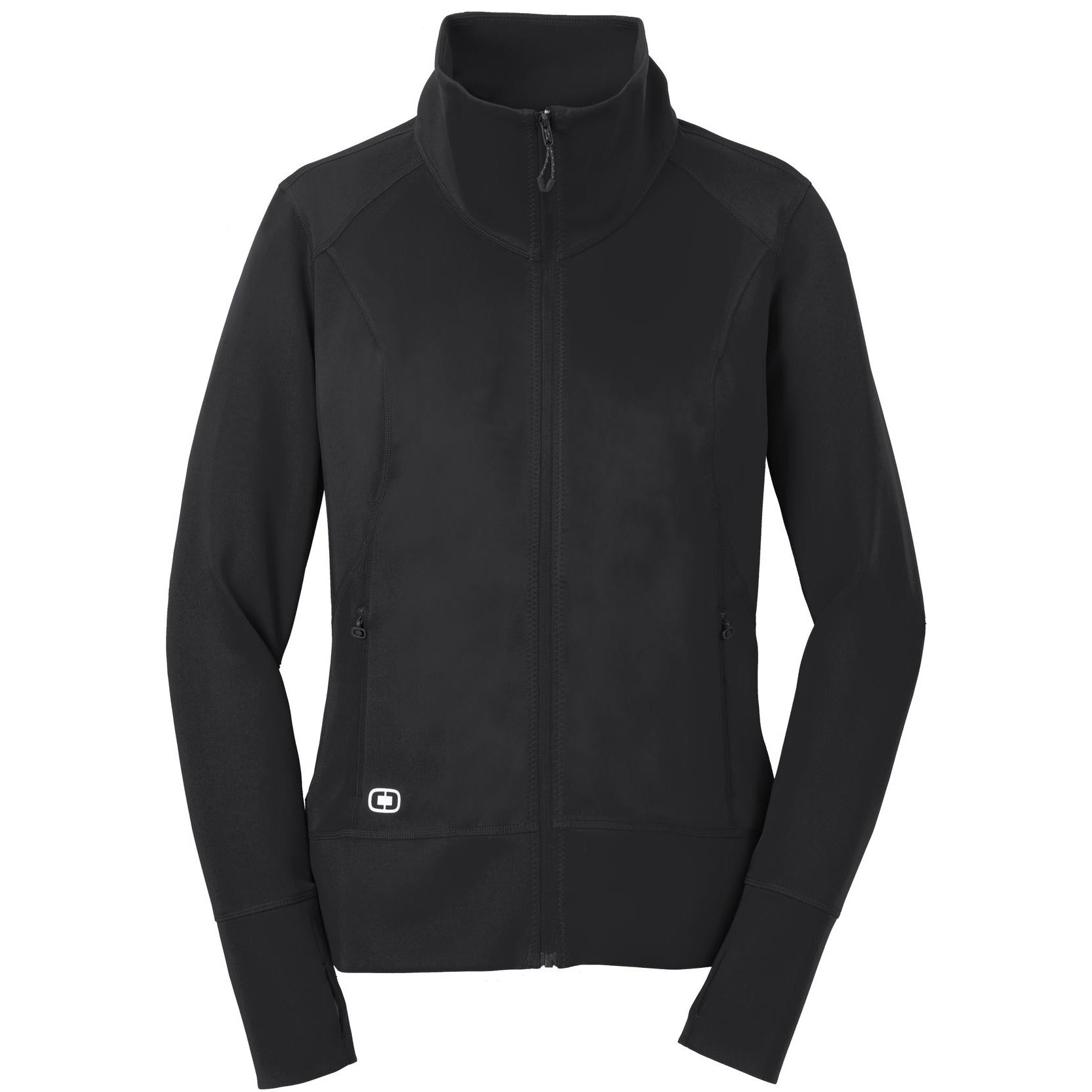 LAYERABLE WARMTH STRETCH FLATLOCK SEAMS FOR COMFORT REFLECTIVE DETAILS | 7.4-ounce, 95/5 poly/spandex jersey Reflective OGIO heat transfer label for tag-free comfort Zip-through cowl collar Reflective O heat transfer at back neck Lower front invisible zippered pockets with O zipper pulls Set-in sleeves with shaped cuffs and thumbholes for warmth Reflective O heat transfer at front right hem O heat transfer at back left hem