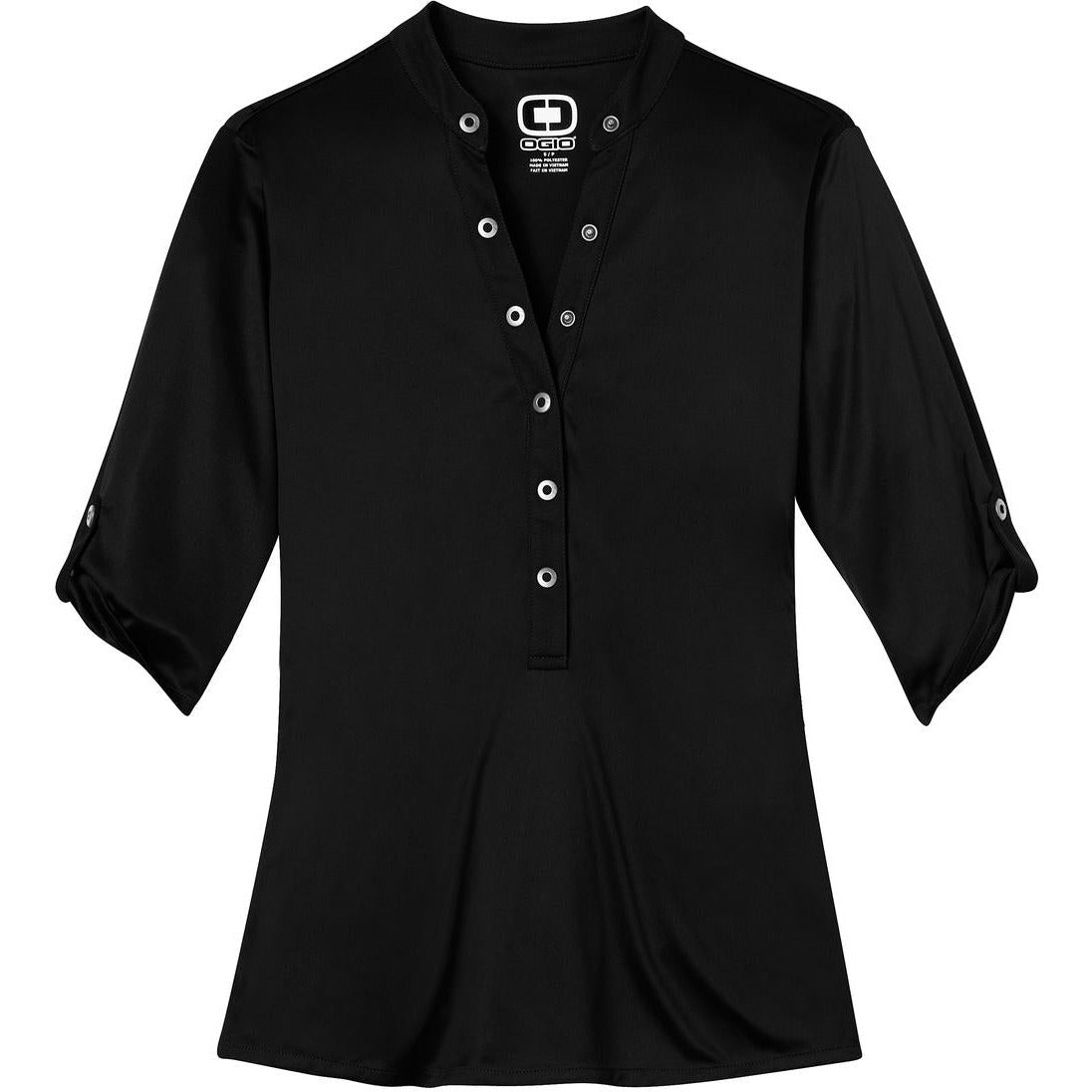 With its 3/4 sleeves and unique sleeve tabs, you'll have a crush on this innovative OGIO henley. 4.9-ounce, 100% poly interlock with stay-cool wicking technology OGIO heat transfer label for tag-free comfort 6-snap pique placket with OGIO-debossed ring snaps Set-in, pique sleeve tabs with OGIO-debossed ring snaps